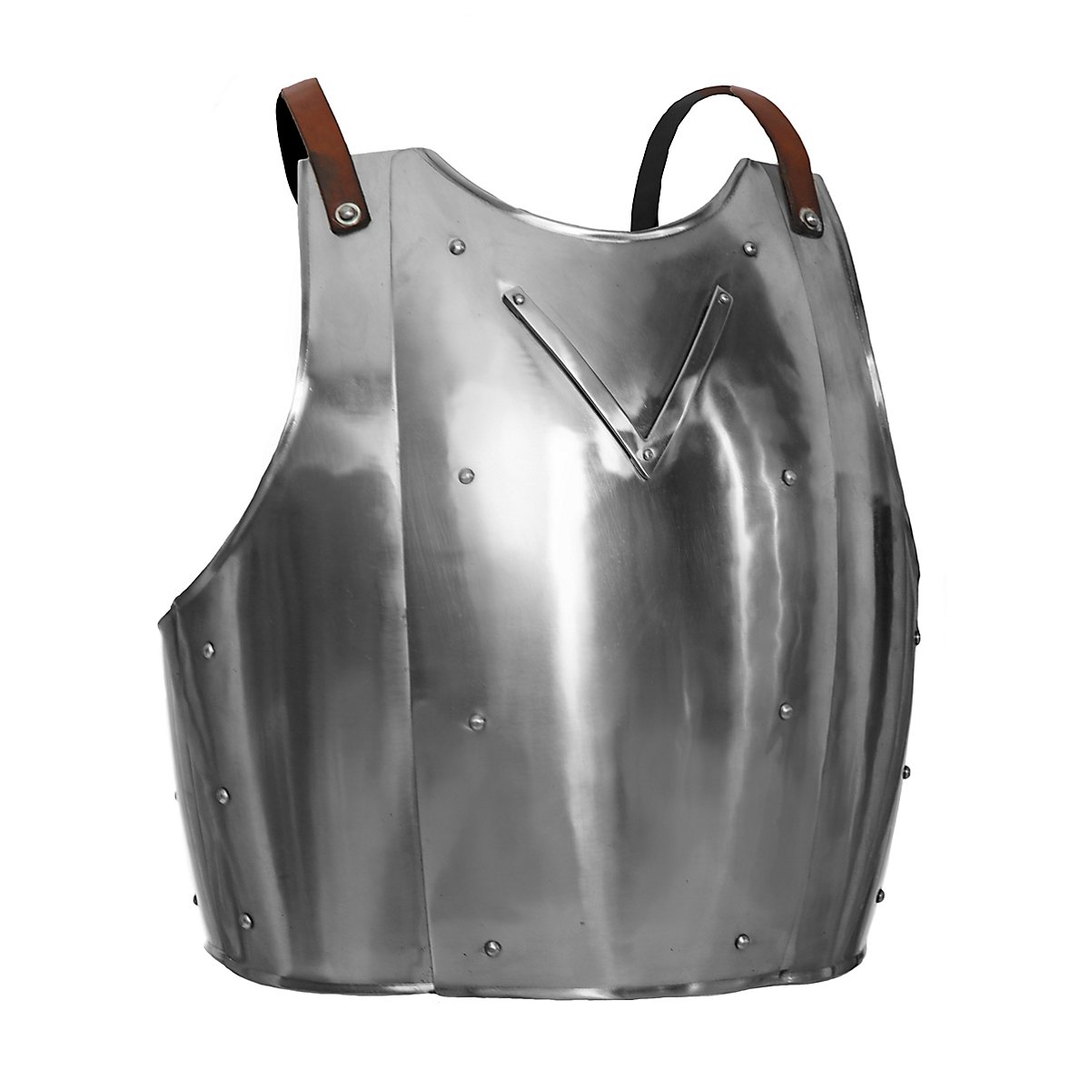 Das aufwenige Riemensystem hilft dabei den Brustpanzer seinem Träger anzupassen. Die Brust ziert ein auffälliges großes "V", welches typisch für die Ritterrüstungen aus Churburg ist.